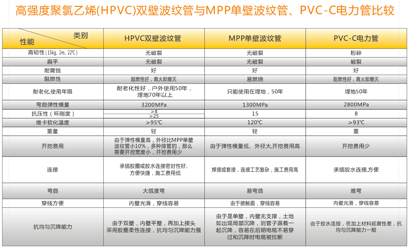 高強(qiáng)度聚氯乙烯(HPVC)雙壁波紋管內(nèi)、外壁之間呈中空環(huán)狀結(jié)構(gòu),充分利用工字鋼結(jié)構(gòu)原理,提高截面慣性矩,環(huán)鋼度高。產(chǎn)品具有強(qiáng)度高、韌性好、質(zhì)地輕等優(yōu)點(diǎn)。產(chǎn)品運(yùn)用開挖工程,可代替MPP單壁波紋管、玻璃鋼管、PVC-C電力管、PVC-U通信管等管材。